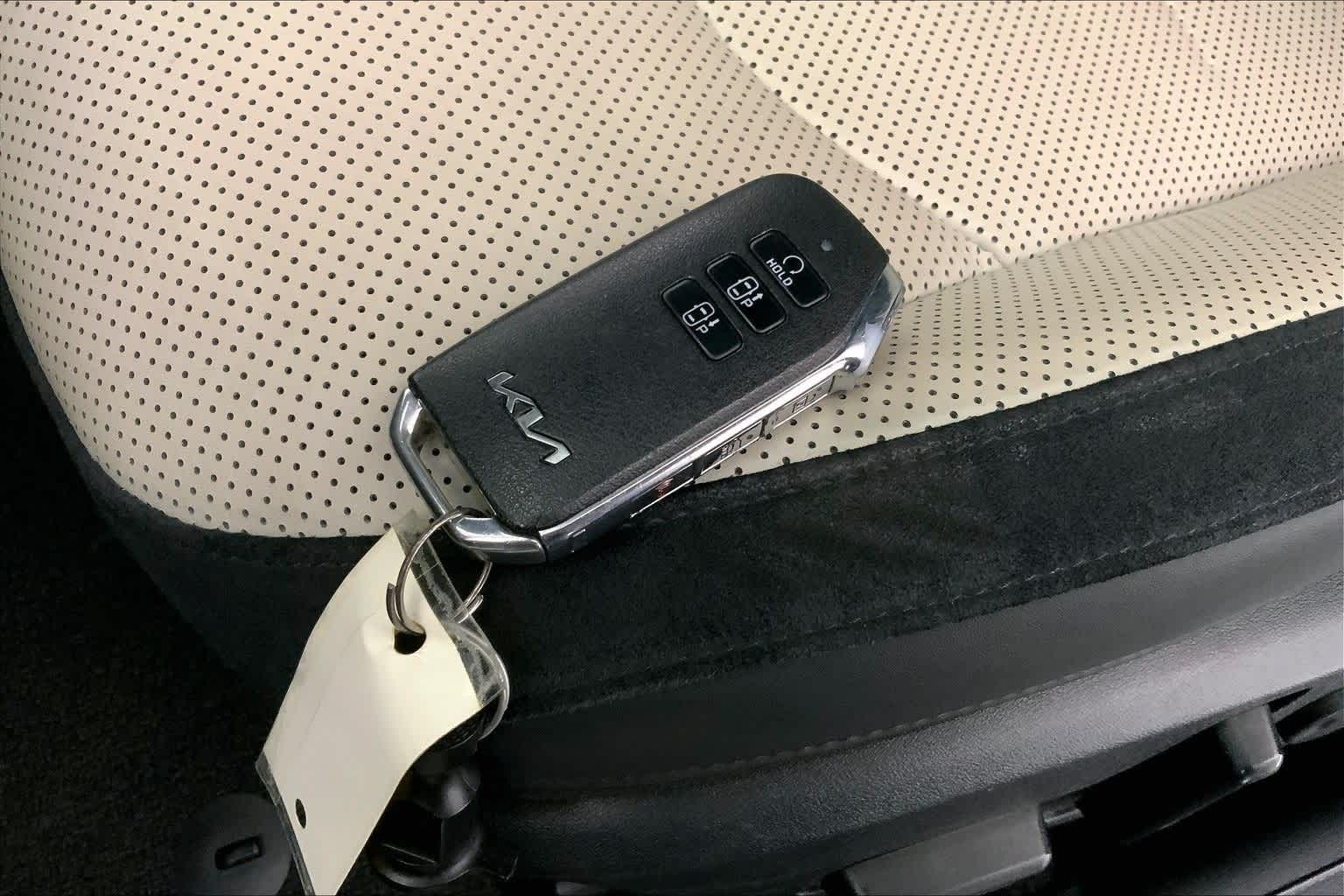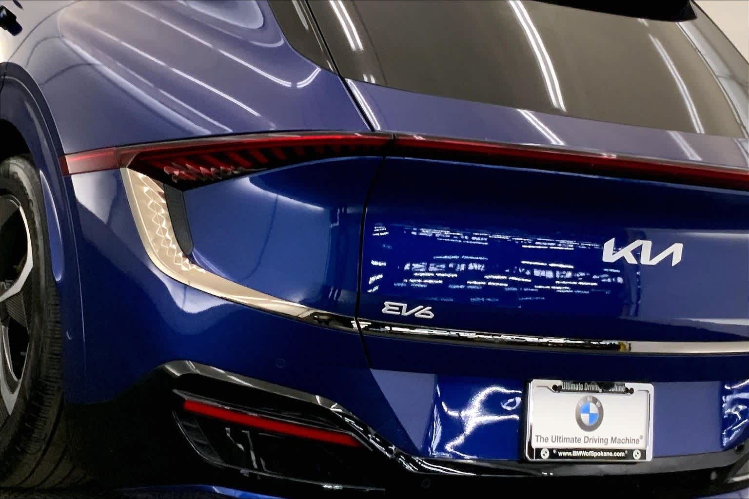 CARFAX One-Owner. Clean CARFAX. Yacht Blue 2023 Kia EV6 GT-Line AWD 1-Speed Automatic Electric Motor 14 Speakers, 4-Wheel Disc Brakes, ABS brakes, Air Conditioning, Alloy wheels, AM/FM radio: SiriusXM, Apple CarPlay & Android Auto, Auto High-beam Headlights, Auto-dimming Rear-View mirror, Automatic temperature control, Axle Ratio: 10.650, Brake assist, Bumpers: body-color, Cargo Mat w/Luggage Board, Cargo Tray w/Luggage Board, Carpet Floor Mats, Delay-off headlights, Driver door bin, Driver vanity mirror, Dual front impact airbags, Dual front side impact airbags, Electronic Stability Control, Emergency communication system, Four wheel independent suspension, Front anti-roll bar, Front Bucket Seats, Front Center Armrest, Front dual zone A/C, Front reading lights, Fully automatic headlights, Garage door transmitter: HomeLink, GT-Line White Seat Package, Heads-Up Display, Heated & Ventilated Front Bucket Seats, Heated door mirrors, Heated front seats, Heated rear seats, Heated steering wheel, Illuminated entry, Knee airbag, Low tire pressure warning, Memory seat, Navigation system: AVN 5.0 Navigation System, Occupant sensing airbag, Outside temperature display, Overhead airbag, Overhead console, Panic alarm, Passenger door bin, Passenger vanity mirror, Power door mirrors, Power driver seat, Power Liftgate, Power moonroof, Power passenger seat, Power steering, Power windows, Radio: Meridian Premium Audio System, Rain sensing wipers, Rear anti-roll bar, Rear seat center armrest, Rear window defroster, Remote keyless entry, Security system, Speed control, Speed-sensing steering, Split folding rear seat, Spoiler, Sport steering wheel, Steering wheel mounted audio controls, Telescoping steering wheel, Tilt steering wheel, Traction control, Trip computer, Turn signal indicator mirrors, Variably intermittent wipers, Vegan Leather Seat Trim, Vegan Leatherette Seat Trim w/Suede Accents, Ventilated front seats, Wheels: 8.0J x 20 Black Painted Alloy, White Seat Color w/Black Accent.