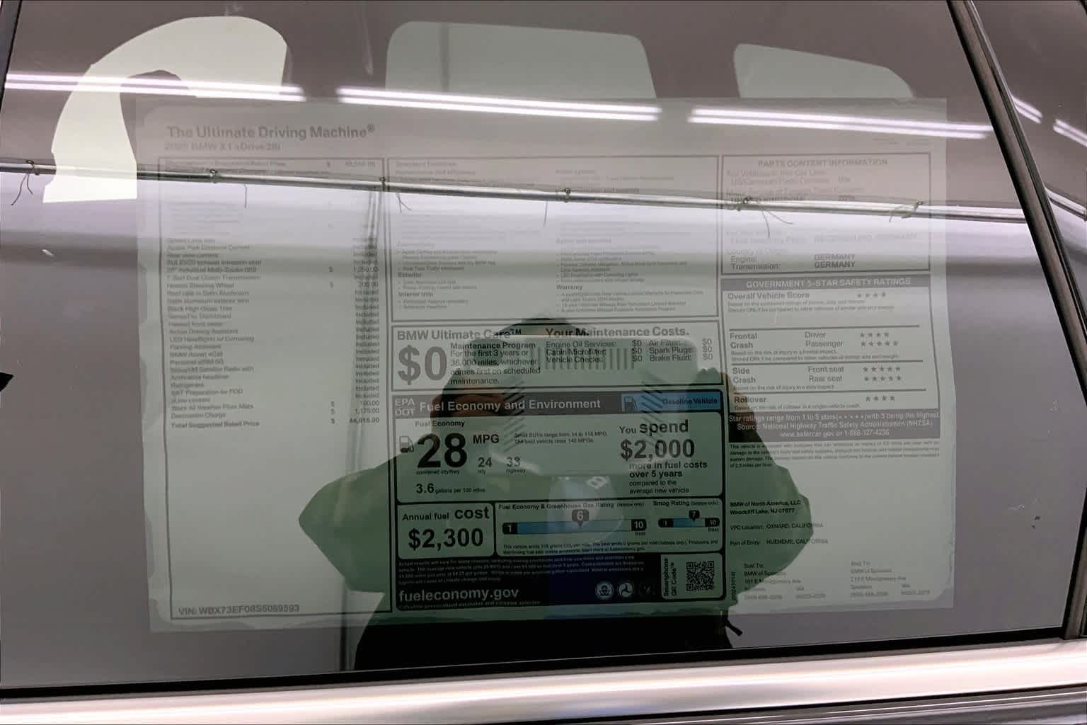 Clean CARFAX. Jet Black 2025 BMW X1 xDrive28i AWD 7-Speed Automatic 2.0L I4 16V TwinPower Turbo 4-Wheel Disc Brakes, 7 Speakers, ABS brakes, Air Conditioning, Alloy wheels, AM/FM Radio, AM/FM radio: SiriusXM with 360L, Apple CarPlay Compatibility, Auto High-beam Headlights, Auto-Dimming Rear-View Mirror, Automatic temperature control, BMW TeleServices, Brake assist, Bumpers: body-color, Comfort Access Keyless Entry, Compass, Convenience Content 1, Convenience Package, Delay-off headlights, Driver door bin, Driver vanity mirror, Dual front impact airbags, Dual front side impact airbags, Electronic Stability Control, Emergency communication system: BMW Assist eCall, Exterior Parking Camera Rear, Four wheel independent suspension, Front anti-roll bar, Front Bucket Seats, Front Center Armrest w/Storage, Front dual zone A/C, Front reading lights, Heated door mirrors, Heated Front Seats, Heated front seats, Heated Steering Wheel, Illuminated entry, Knee airbag, Leather steering wheel, Low tire pressure warning, Memory seat, Navigation, Navigation System, Occupant sensing airbag, Outside temperature display, Overhead airbag, Overhead console, Panic alarm, Panoramic Moonroof, Passenger door bin, Passenger vanity mirror, Perforated Veganza Upholstery, Power door mirrors, Power driver seat, Power Front Seats, Power Liftgate, Power passenger seat, Power steering, Power windows, Radio data system, Rain sensing wipers, Rear anti-roll bar, Rear reading lights, Rear seat center armrest, Rear window defroster, Rear window wiper, Remote keyless entry, Security system, Speed control, Speed-sensing steering, Speed-Sensitive Wipers, Split folding rear seat, Spoiler, Sport Seats, Steering wheel mounted audio controls, Tachometer, Telescoping steering wheel, Tilt steering wheel, Traction control, Trip computer, Turn signal indicator mirrors, Variably intermittent wipers, Wheels: 18 x 7.5 V-Spoke Bi-Color, Wheels: 20 x 8.0 Individual Multi-Spoke, Widescreen Display, Wireless Device Charging.